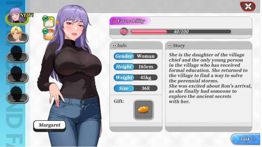 玛格丽特:村长的女儿,对外面的世界充满向往,紫色的长发,身材凹凸有致。
